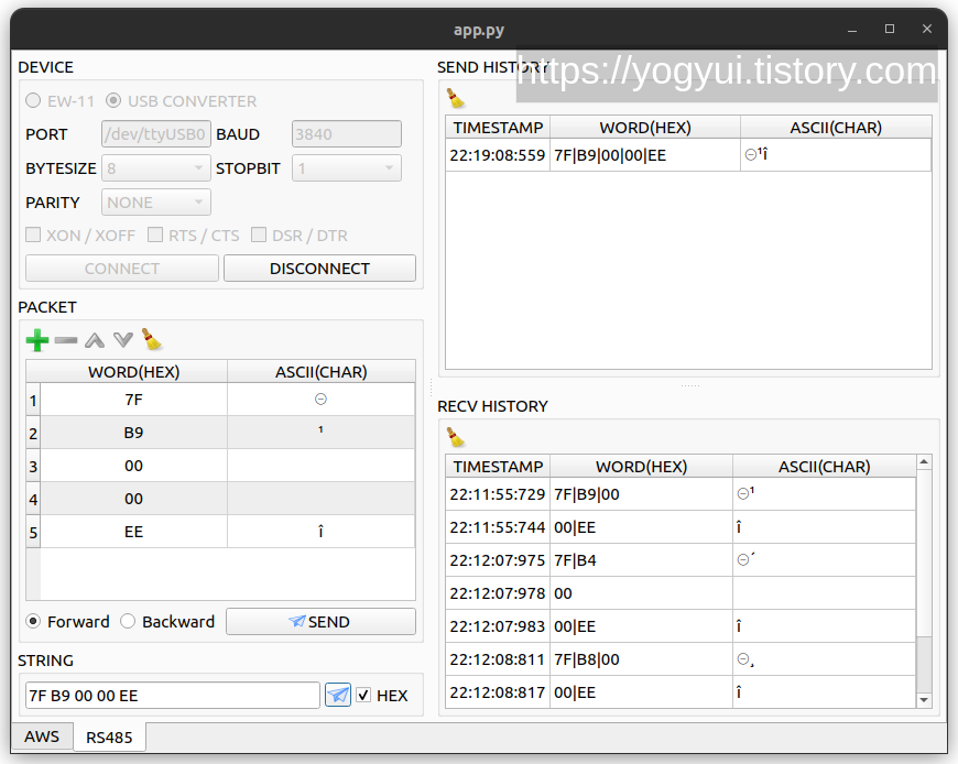 EW-11은 커스텀 baudrate를 설정할 수 없어서 (혹은 내가 방법을 몰라서...), USB-to-RS485 컨버터를 랩탑에 연결해서 간단하게 시리얼 패킷을 캡쳐해봤다 (캡쳐 프로그램은 뭐... 평소에 내가 파이썬으로 만들어 쓰던걸로 ㅎㅎ)